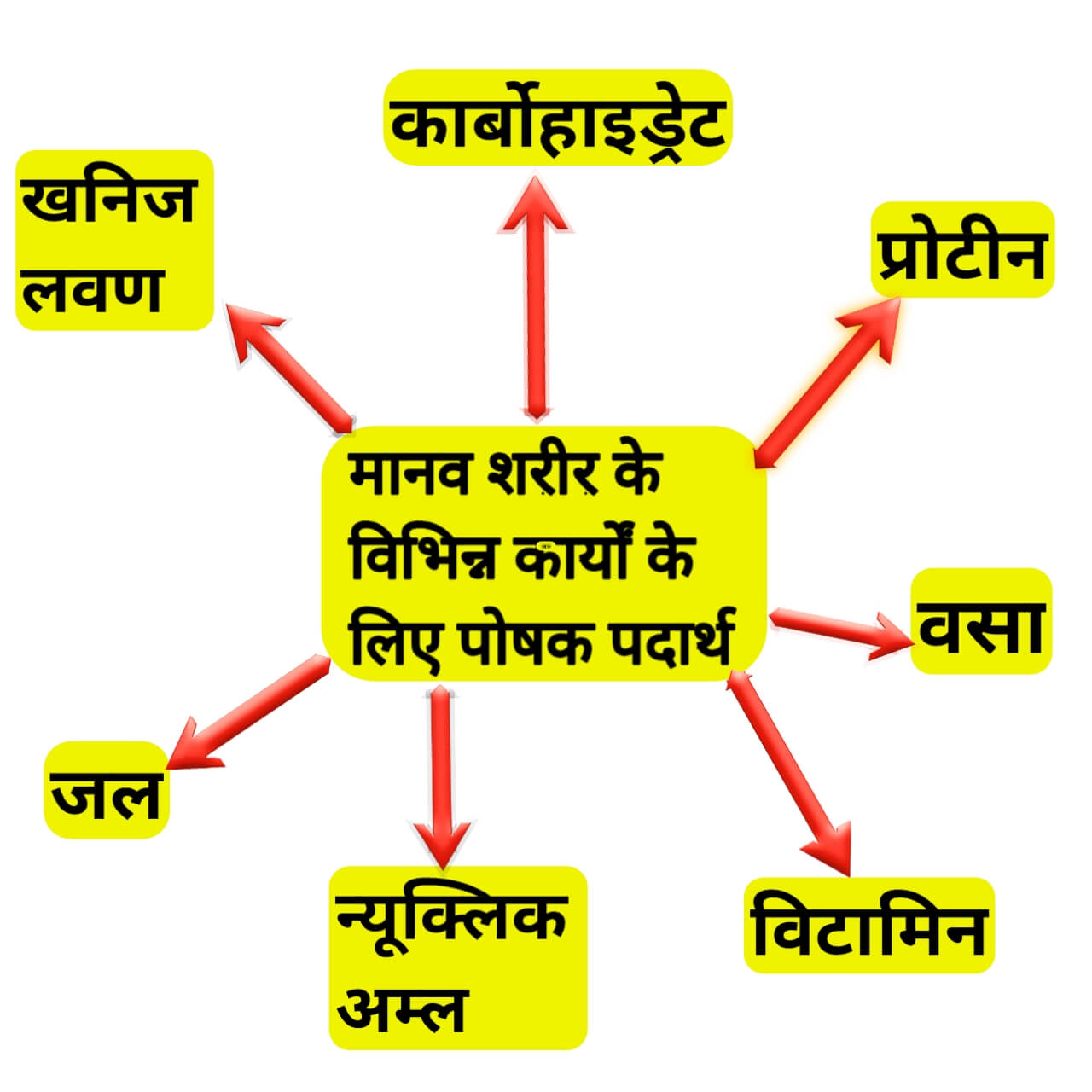 मनुष्य के शरीर के विभिन्न कार्यों के लिए निम्नलिखित पोषक पदार्थों की आवश्यकता हैं। :-
