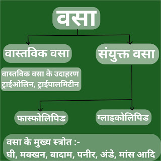 - सर्वाधिक वसा अंडे के योक व मक्खन में पाई जाती है।