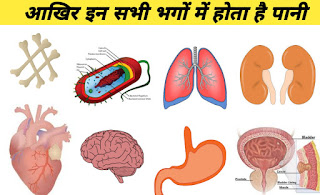 कुछ पानी हमारी किडनी (Kidney) में और कुछ पानी हमारे लीवर (Liver) में, हमारे पेट (Stomach) और मूत्राशय (Bladder) और रीढ़ की हड्डियों (Spinal Cord) में इकट्ठा हो जाता है। हमारे दिल और दिमाक 75% पानी से बने है। वहीँ हमारे फेफड़ों में लगभग 83% पानी मौजूद होता है। लेकिन पुरे शरीर में सबसे ज्यादा पानी हमारी कोशिकाओं में होता है। आपको जानकर हैरानी होगी की हमारी हड्डियां जो की पूरी तरह सख्त और सुखी दिखाई देती है, उनके अंदर भी 31% तक पानी होता है।